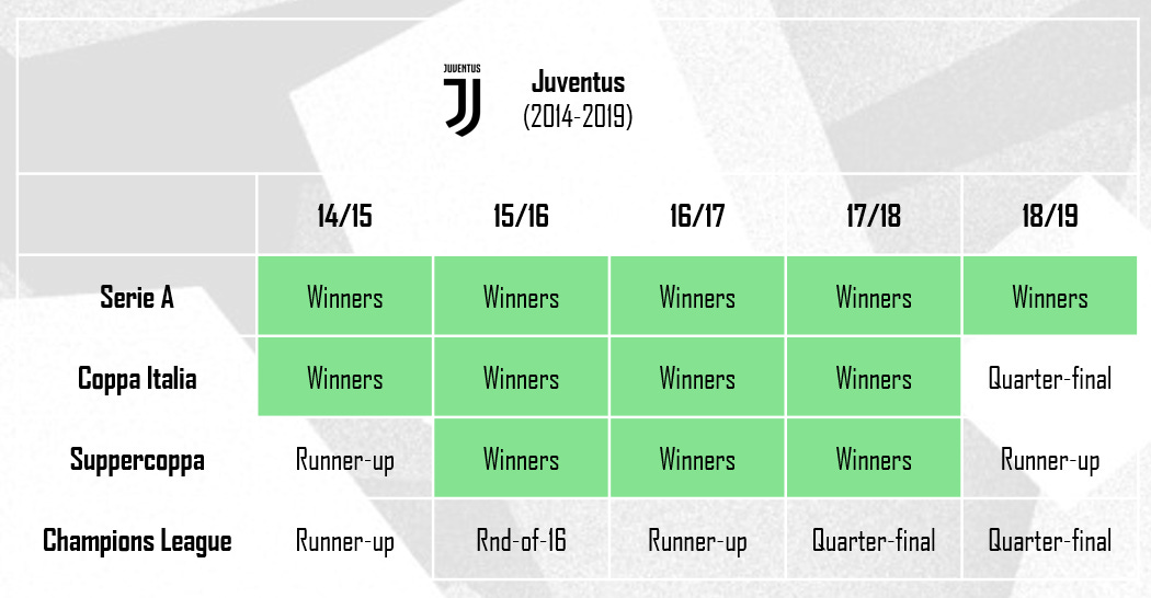 Although Juventus, the outstanding team of the 2010s in Italy, reached the Champions League final on two occasions between 2015 & 2017, they too found it a step too far to bridge the gap of domestic dominance and European conquerors, despite their 12 domestic titles during the period between 2014 & 2019.